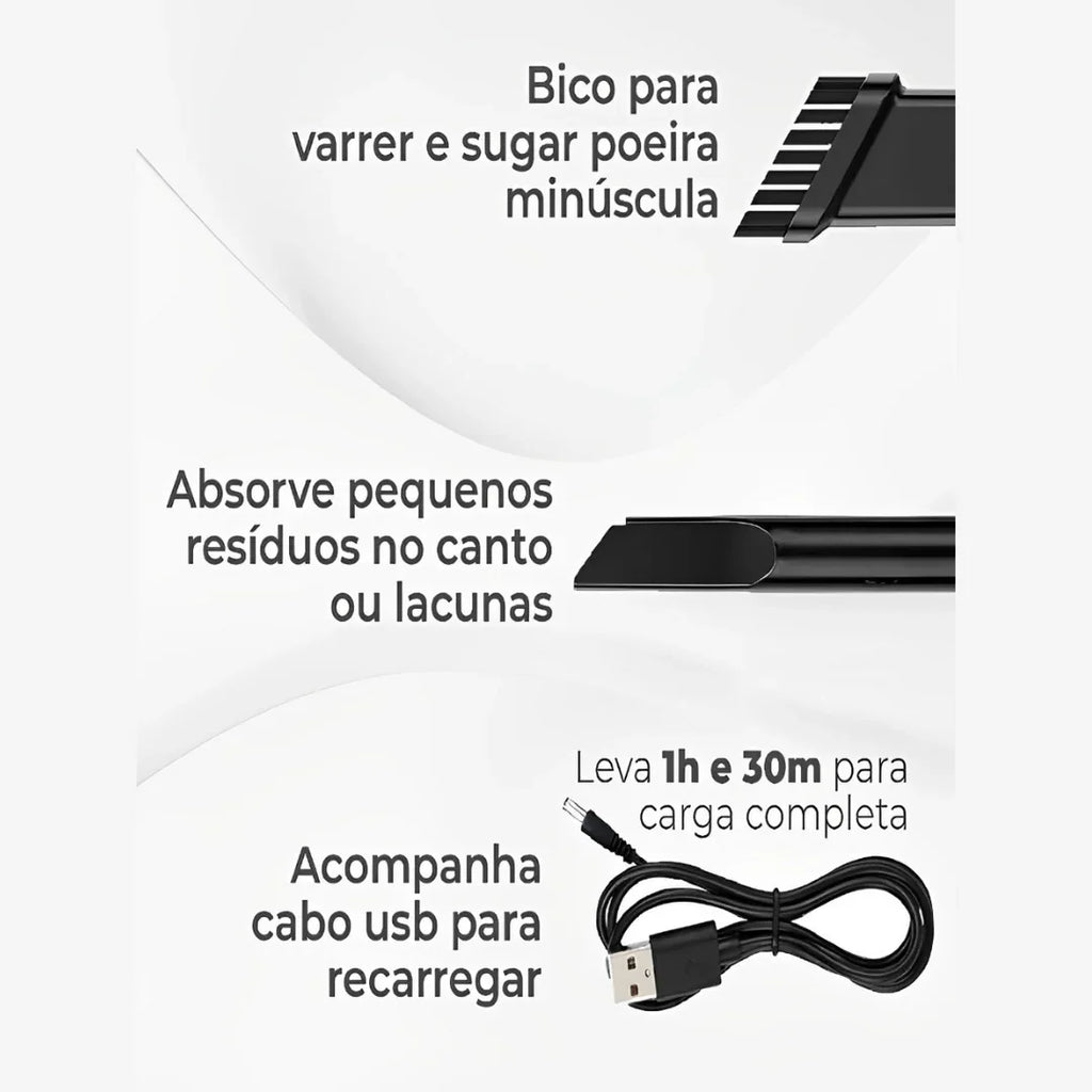 Compacto, potente e sem fio Com sucção de 6000Pa, ele remove sujeira, pelos, migalhas, pó etc Ideal para uso doméstico ou no carro